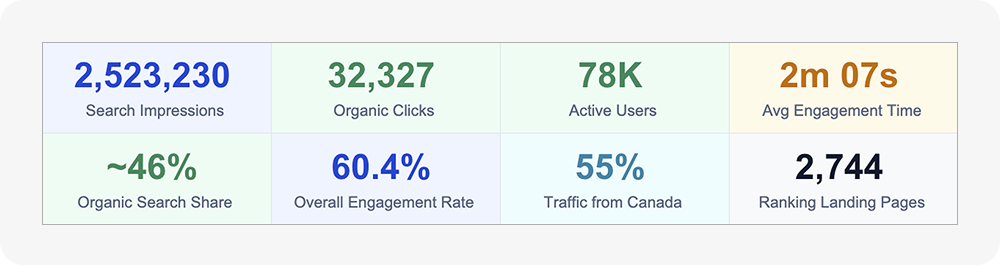 In the second half of 2025, Noseberry Digitals led the SEO & Content strategy that scaled Harrington Housing’s organic search presence to become the dominant co-living and student housing organic brand across Canada – reaching 2.5 million search impressions and 32,327 clicks in 6 months.
