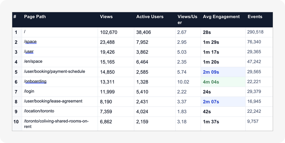 77,843 active users across 10+ countries. Canada dominates at 55% – confirming the location SEO strategy is working for the core market. India (3m 46s engagement), France (4m 00s), and Türkiye (3m 02s) show strong international engagement, suggesting international student demand for Canadian co-living that is worth targeting with dedicated content.