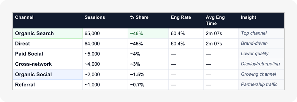 Organic search becoming our top channel in 6 months was the goal we set at the start. Seeing it overtake direct traffic in the data was the confirmation we needed that the strategy was working.
