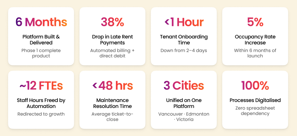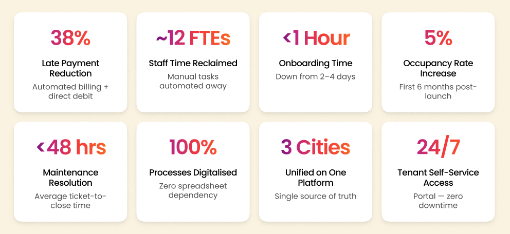 The following results were measured across the first six months following the platform launch. Every metric represents a direct improvement on the baseline established during the discovery phase – from operational efficiency and revenue performance to tenant satisfaction and conversion rate.ย