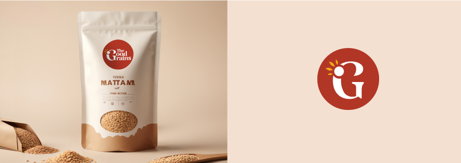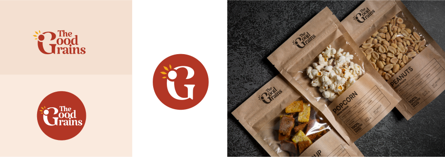 The final logo for The Good Grains captures the brand’s essence through symbolic simplicity. The bold “G” serves a dual purpose, representing both “Good” and “Grain,” anchoring the brand’s identity in quality grains. The “G” includes a grain-like motif styled as sun rays, symbolizing growth, energy, and vitality – qualities central to wholesome, nutritious products. A clean, bold typeface conveys reliability and simplicity, with “Good” taking prominence to reinforce quality. The deep red-brown background evokes an organic, earthy vibe, while yellow sun accents add warmth, creating an inviting, authentic feel that resonates with health-conscious consumers.