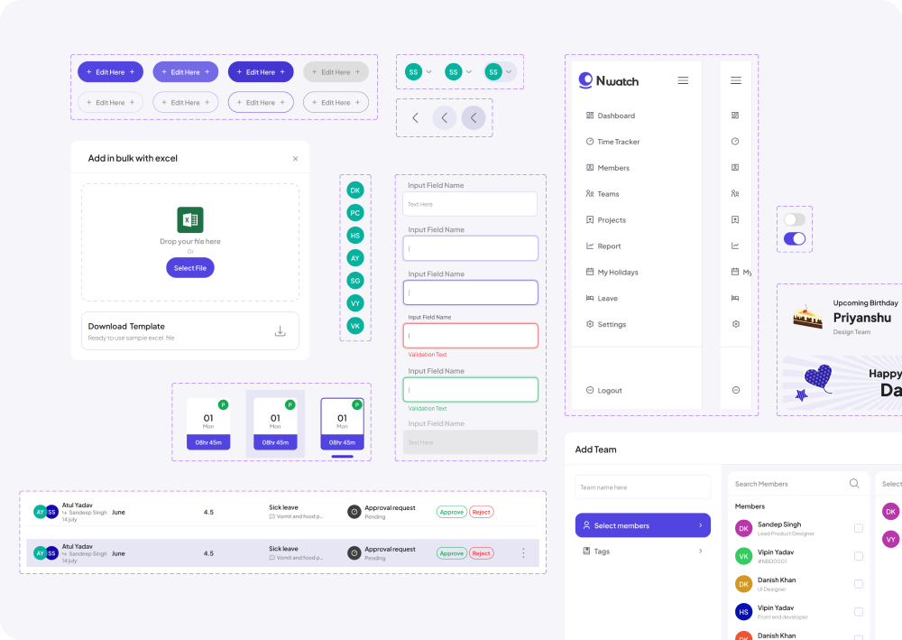 The design system for N-Watch was built to ensure consistency and efficiency in the application. It included a set of reusable components, such as buttons, form inputs, colors, and typography, that helped maintain a uniform look and feel throughout the app. This approach not only made the user interface more cohesive but also made the design and development process faster and easier.