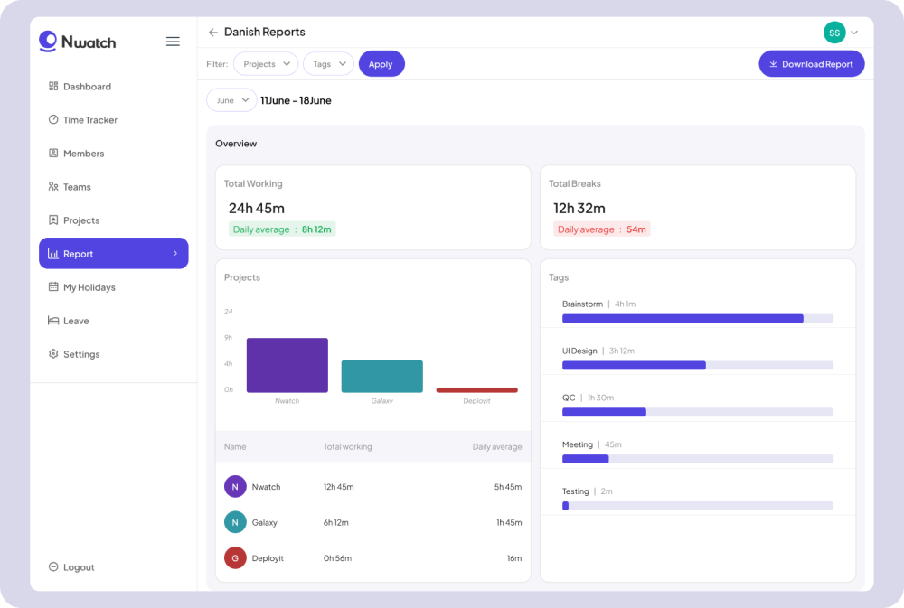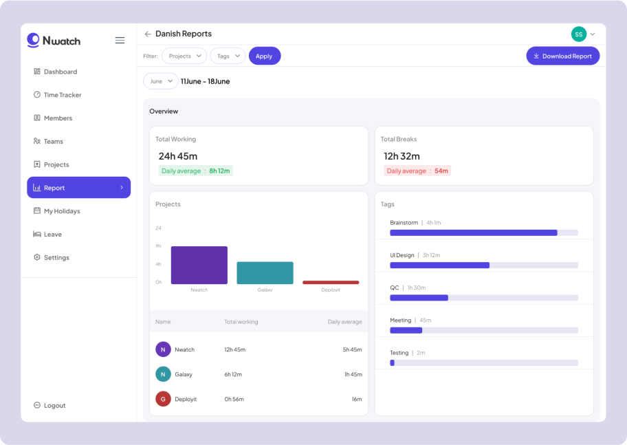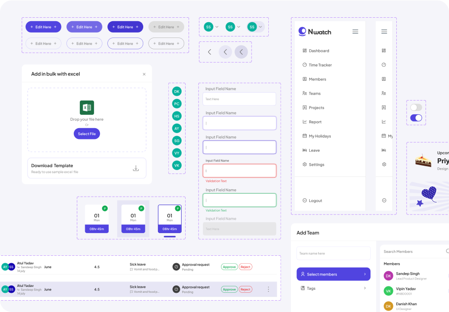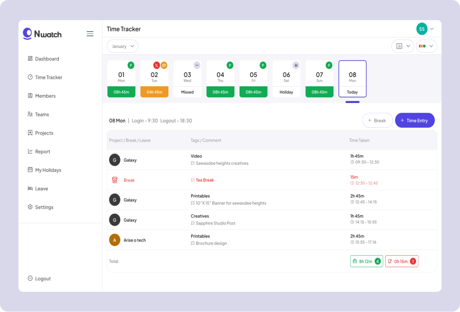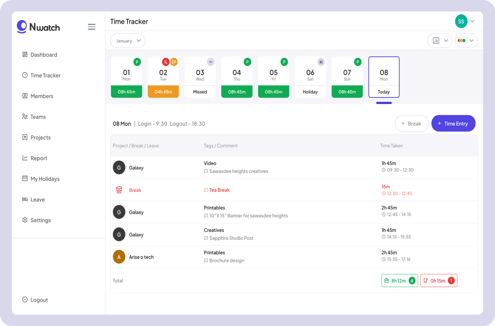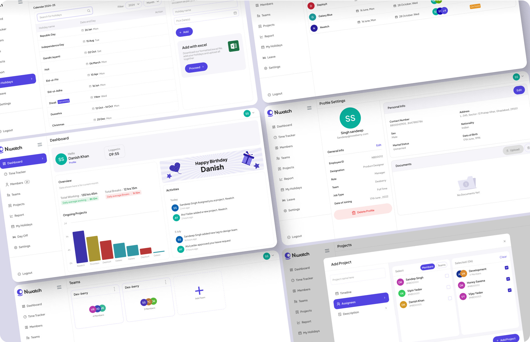 N-Watch is equipped with additional features that enable companies to efficiently manage yearly holidays, add new projects, onboard team members, and organize teams. These tools further enhance the systemβs capability to streamline business operations and team management.