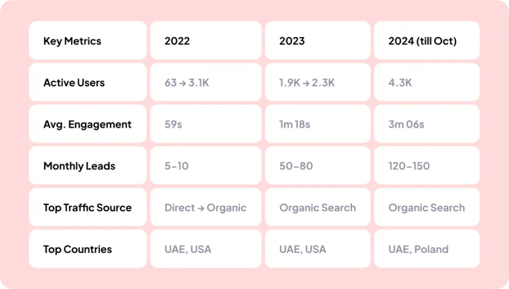 The core challenge was not simply increasing rankings, but transforming SEO into a structured, compounding growth channel capable of delivering consistent traffic, engagement, and qualified leads over time.